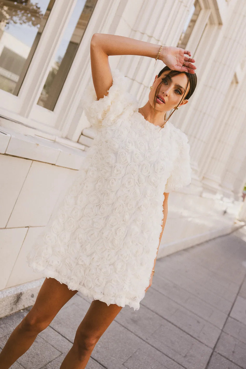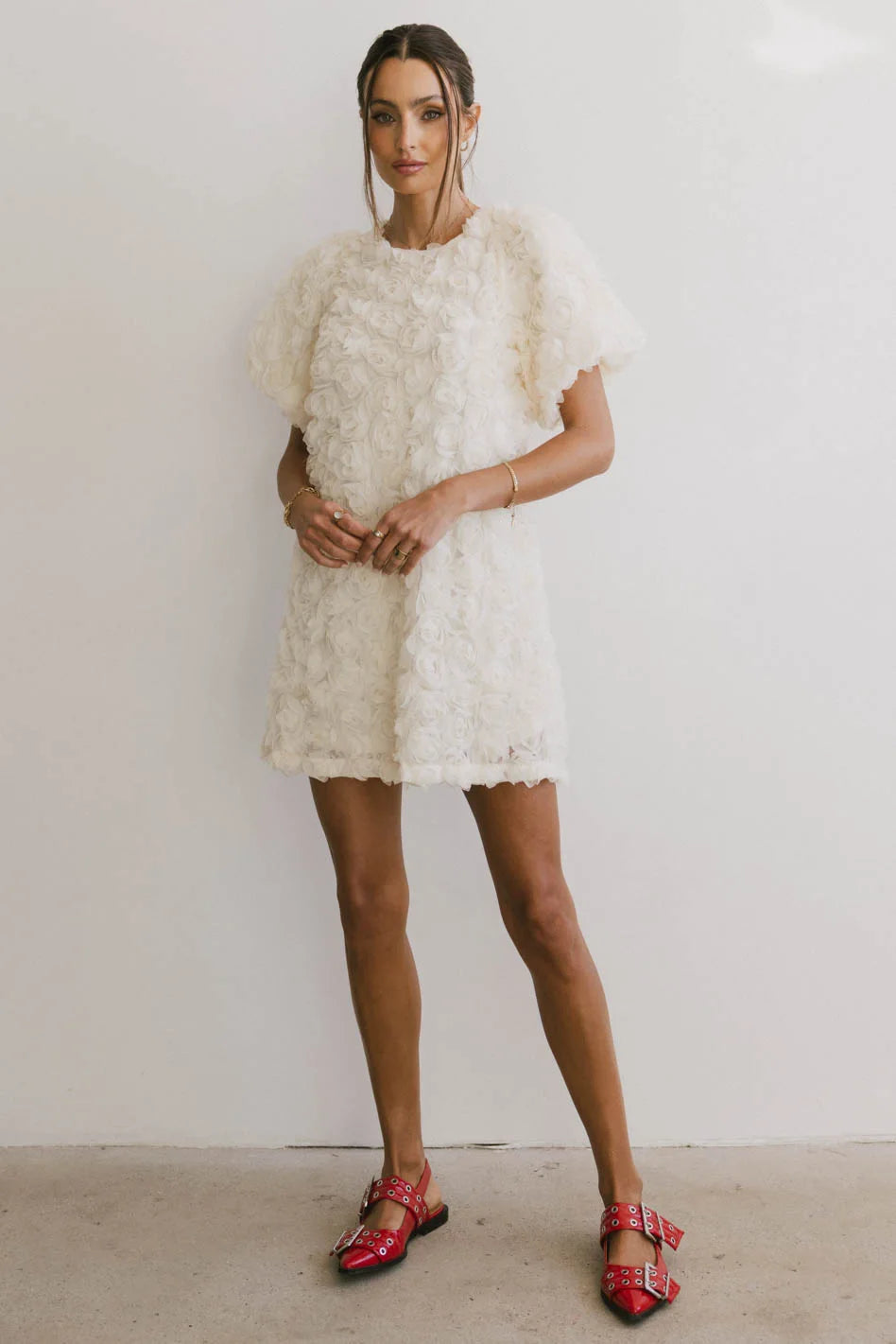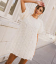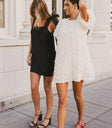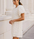 The Andria Rosette Mini Dress brings a romantic vibe with its delicate tulle rosette details. It’s perfect for a daytime gathering, pairing effortlessly with simple heels for a sweet and polished look. The back tie closure adds a charming touch.