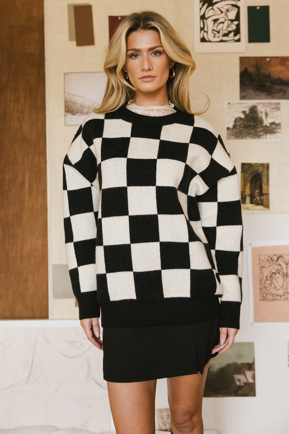 Stay fashionable in our black and white checkered sweater, perfect for cooler days. Whether it's a casual weekend or a cozy evening out, this sweater adds charm to any outfit.