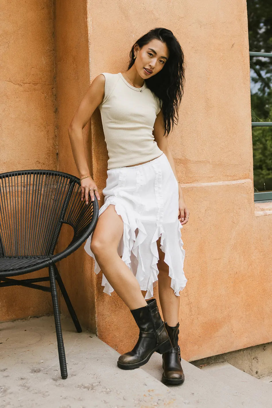 The Arista Ruffled Midi Skirt in White is a must have for a playful summer look. This skirt was made to transition seamlessly from brunch with your sister, to dancing the night away with your girls. Pair with a strappy sandal and a cropped baby tee.