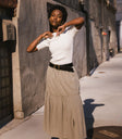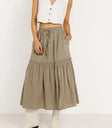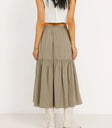 We heard you're looking to make some spring wardrobe updates, so we'd like you to meet the Aspen Midi Skirt in Olive. The flowy tiers and front slit make this skirt trendy, and a breeze to style. Try it with a pair of platform sandals and a quilted tote.