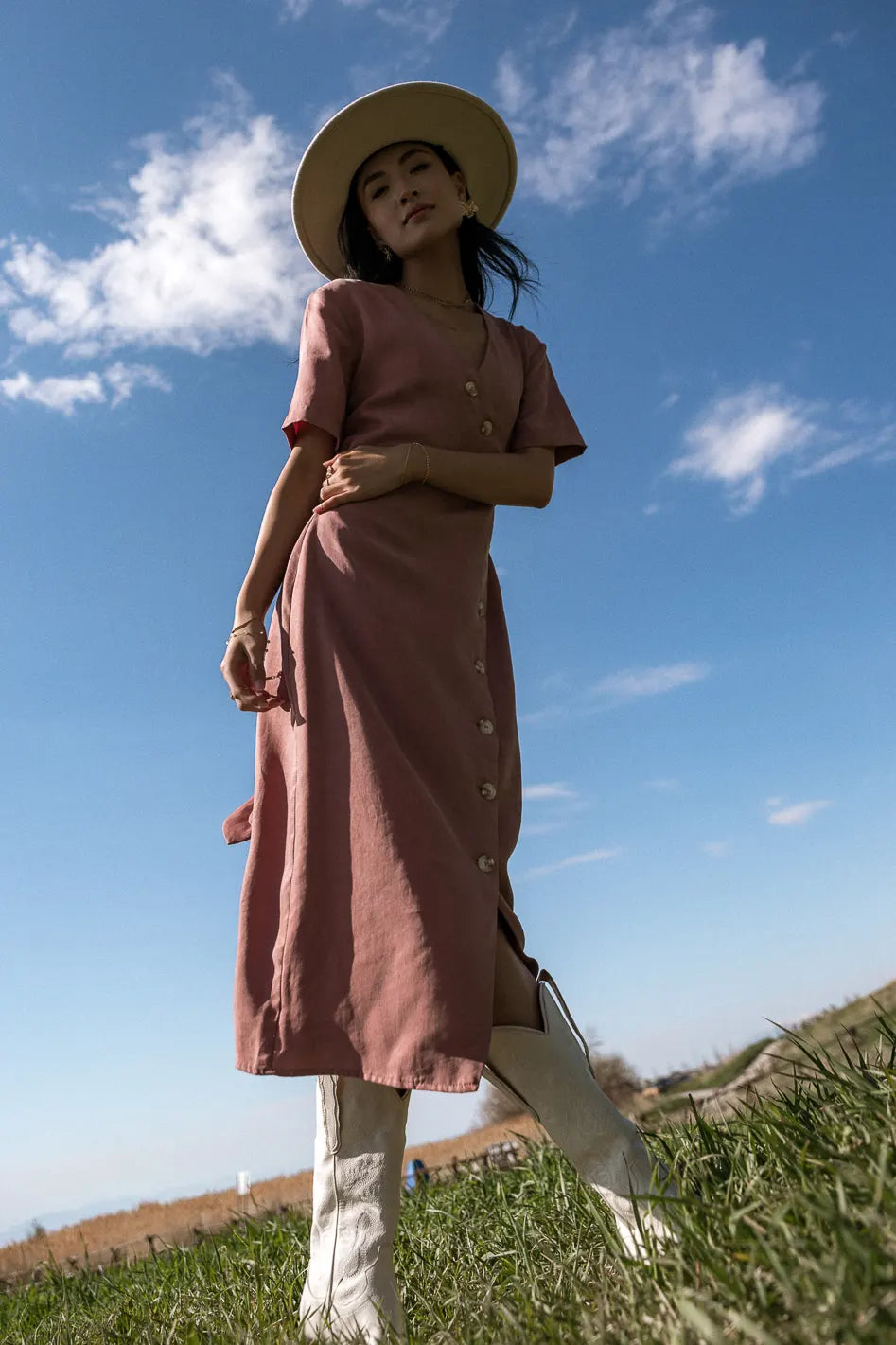 The Bhar Wrap Midi Dress in Clay is the definition of sophisticated. From wedding guest to managing partner, this dress adapts to all of your roles. We recommend styling with some bold flats and a sleek claw clip.