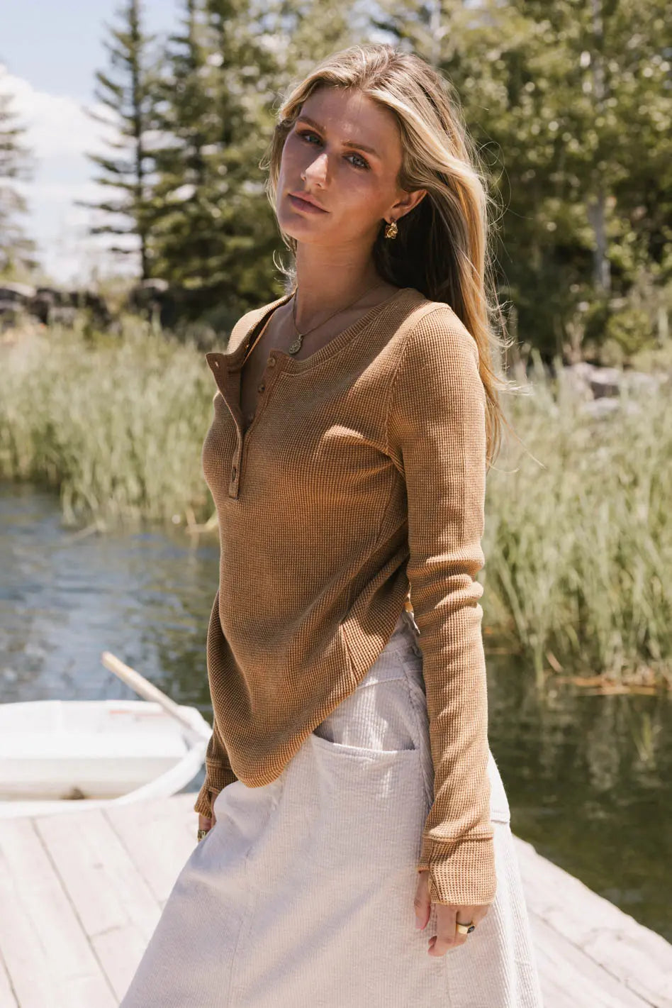 The Conrad Fitted Waffle Tee is your go-to for casual days, with its comfy waffle texture and thumb hole cuffs. It's perfect for layering or wearing on its own with jeans. The five-button detail adds a little extra to this easy everyday piece.