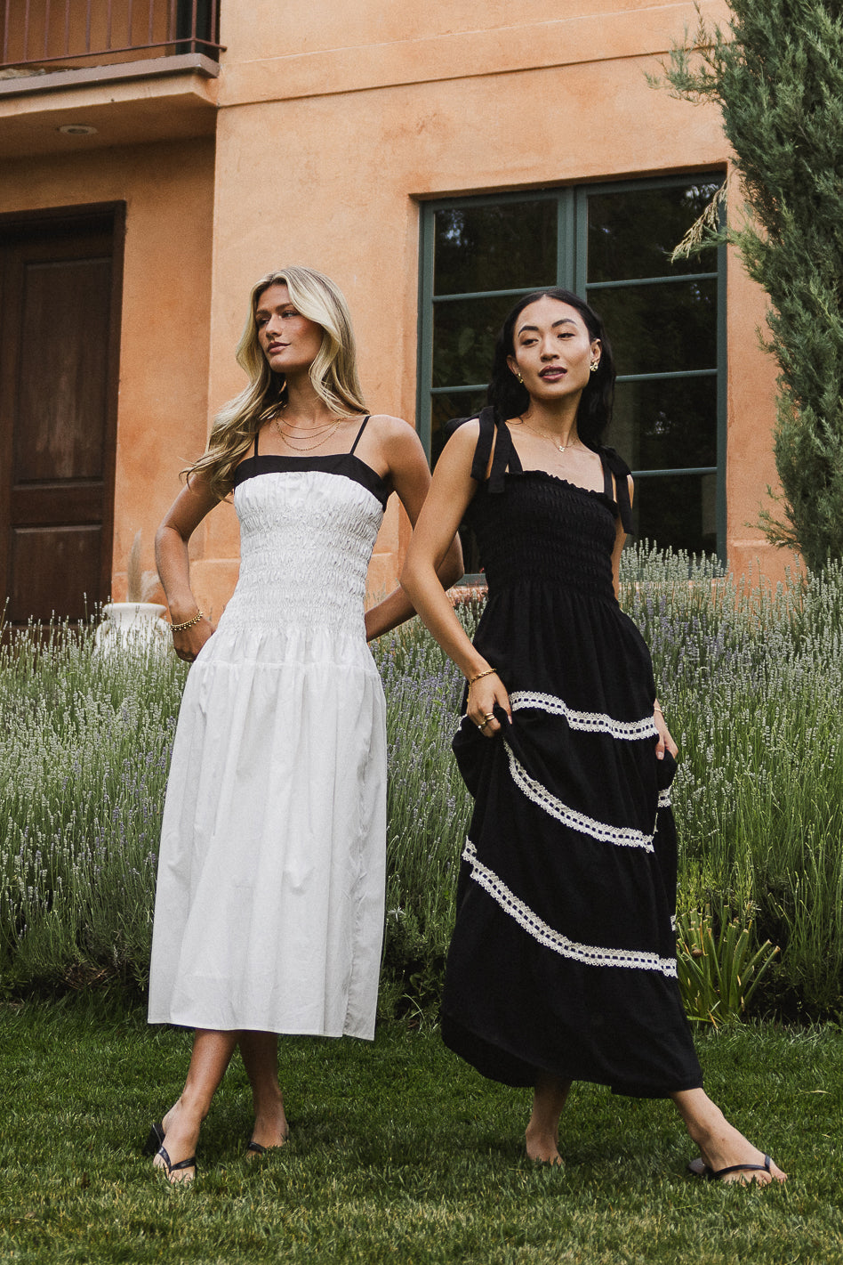 The Contra Smocked Maxi Dress is romantic and elegant. Dinner dates and evening festivities reach new heights with the delicate lace and ribbon details. Pair with a strappy sandal and a clutch.