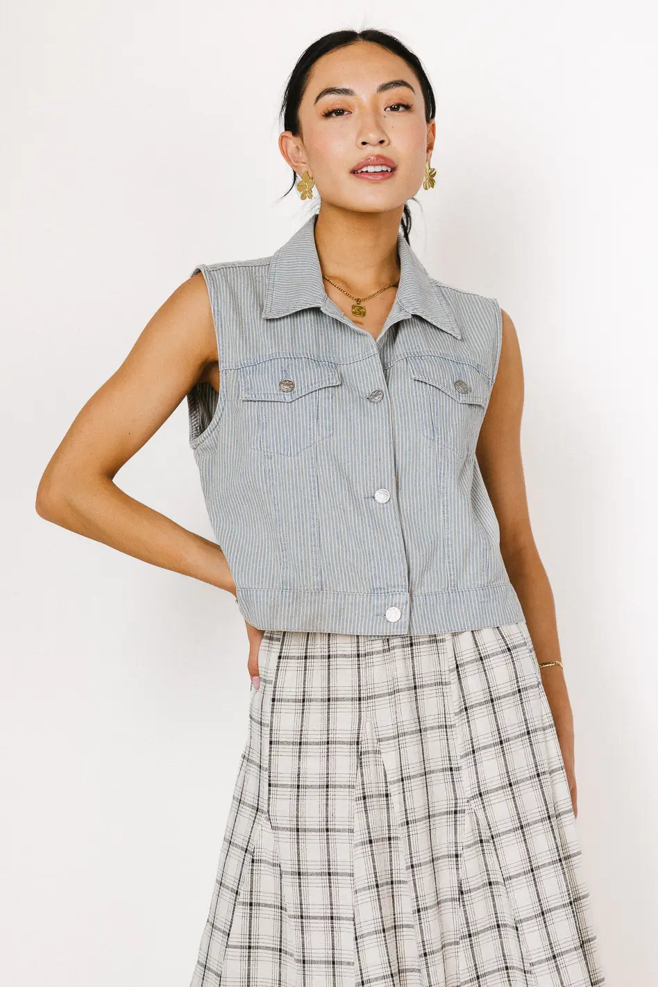 Grab a pair of cargos, a basic tee and your favorite sneakers to style with the Daphne Striped Denim Vest. This layering piece is sure to be a fan favorite for trips to the mall, or walks around the park.