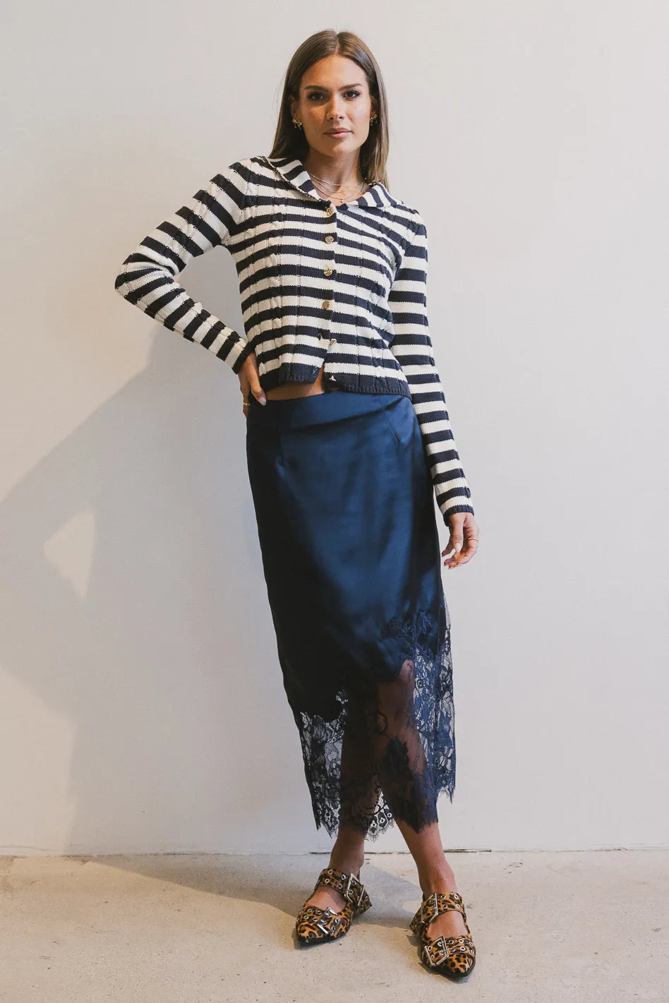 Weddings and formal dinners just got a whole lot better with the Frankie Asymmetrical Skirt in Navy as your plus one. Light colored blouses are the perfect addition to any outfit this skirt starts.