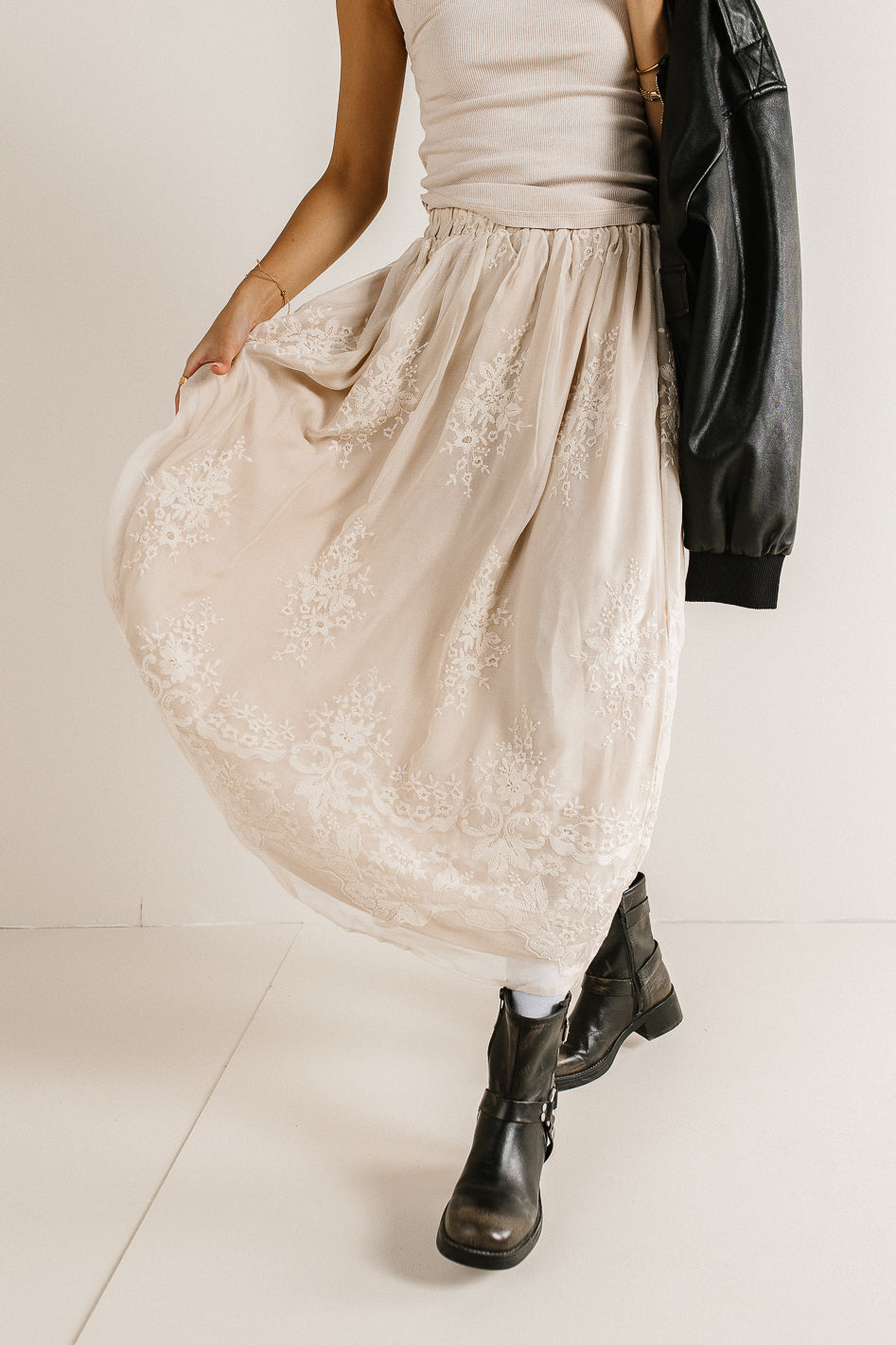 Neutral colors with elegant materials-- That's why we live for the Grace Floral Tulle Skirt in Champagne. This maxi skirt has all the makings of a perfect evening wear bottom. Style it with a strappy heel.