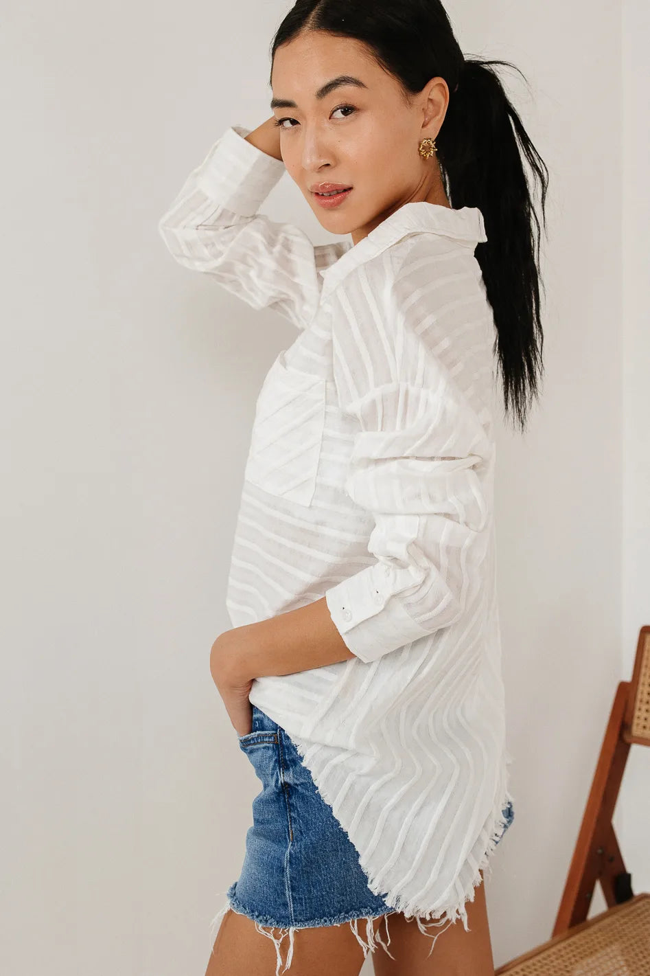 The Nyah Striped Button Up in White is the best all-around top. This is the kind of blouse you can dress up for a date or lounge around in at home. Offset the buttons, tuck into some sweatpants and grab a claw clip for an effortless look.