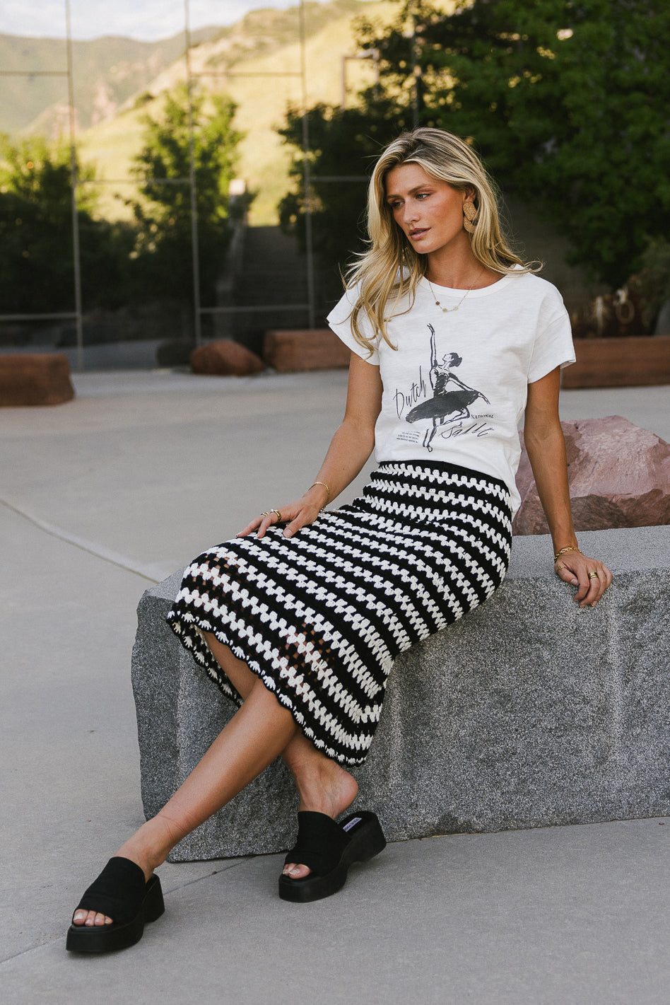 Crochets are so in this season and the Rylan Crochet Skirt in White is the perfect addition to your collection. This skirt is so much fun and we love the high contrast of the black and white. Style this skirt with a boxy black tee and a pair of sneakers.