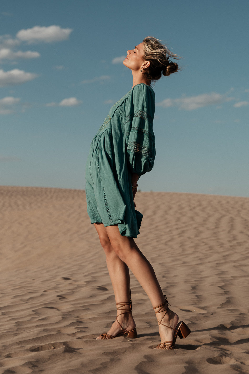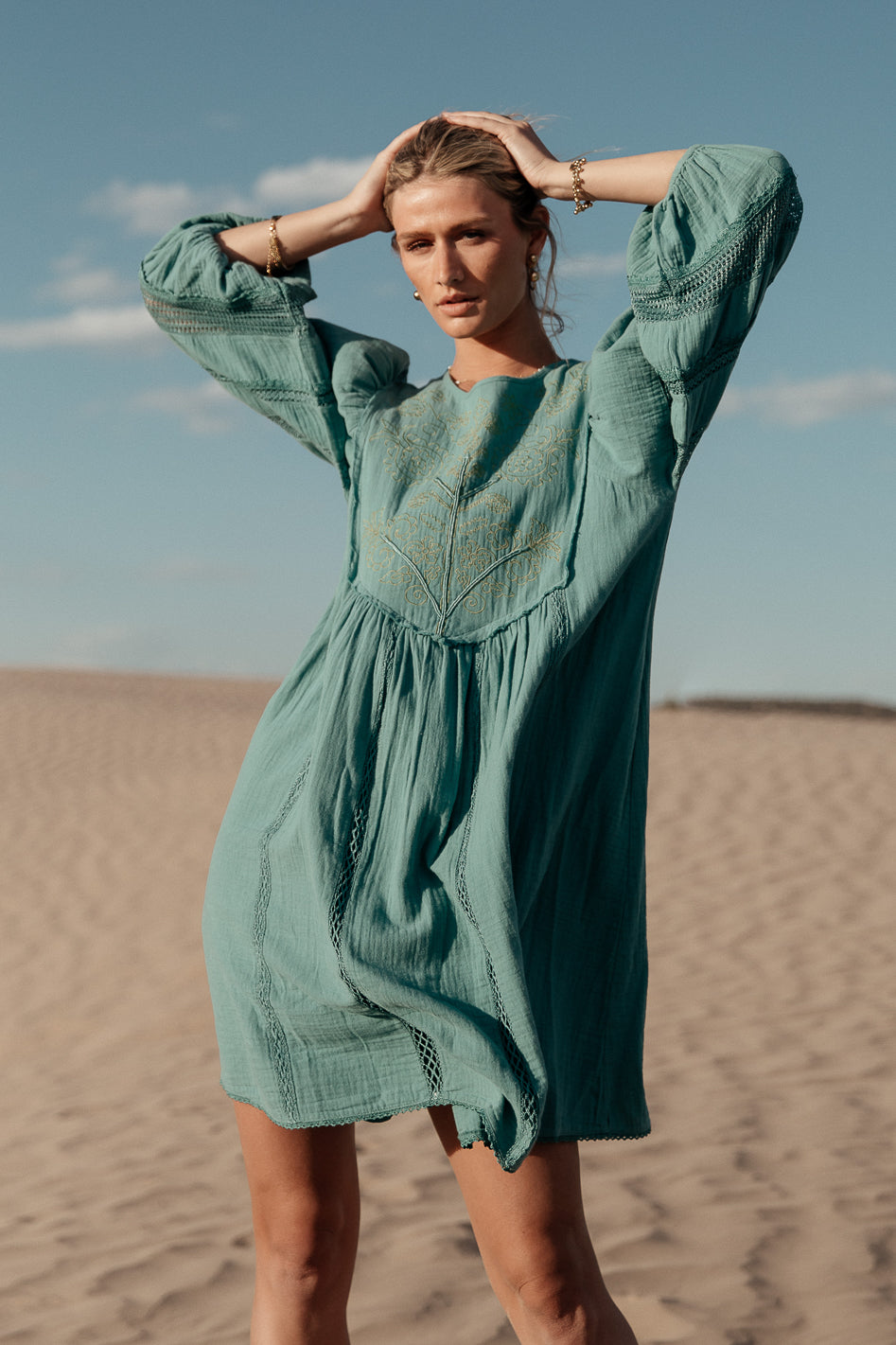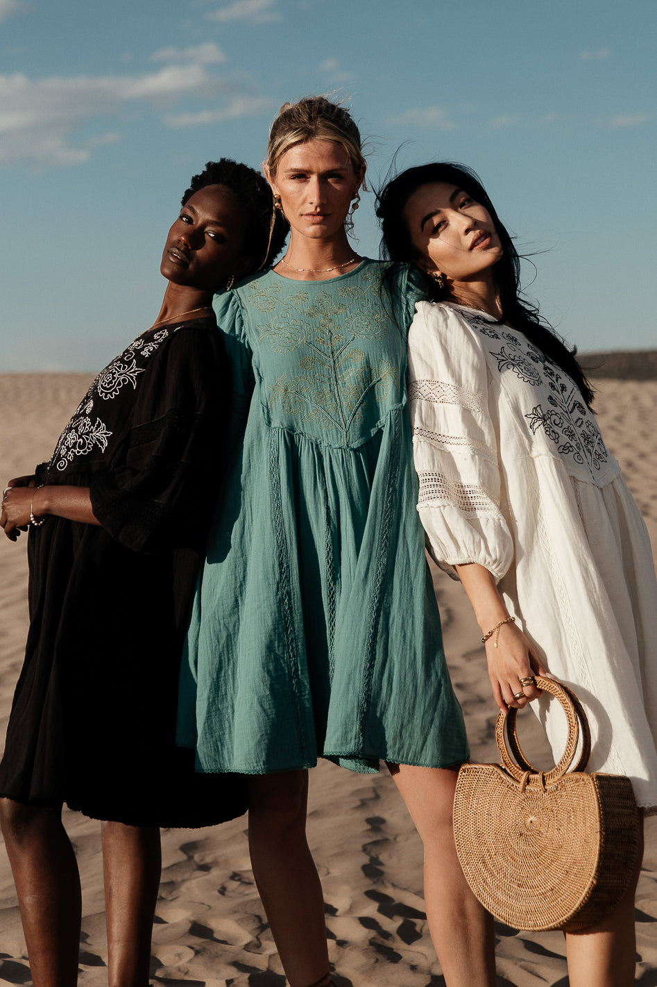 The Serendipity Embroidered Dress in Light Teal is our latest favorite because of its bright and bold colors. Pair this textured dress with a platform sandal for an easy wedding guest outfit.