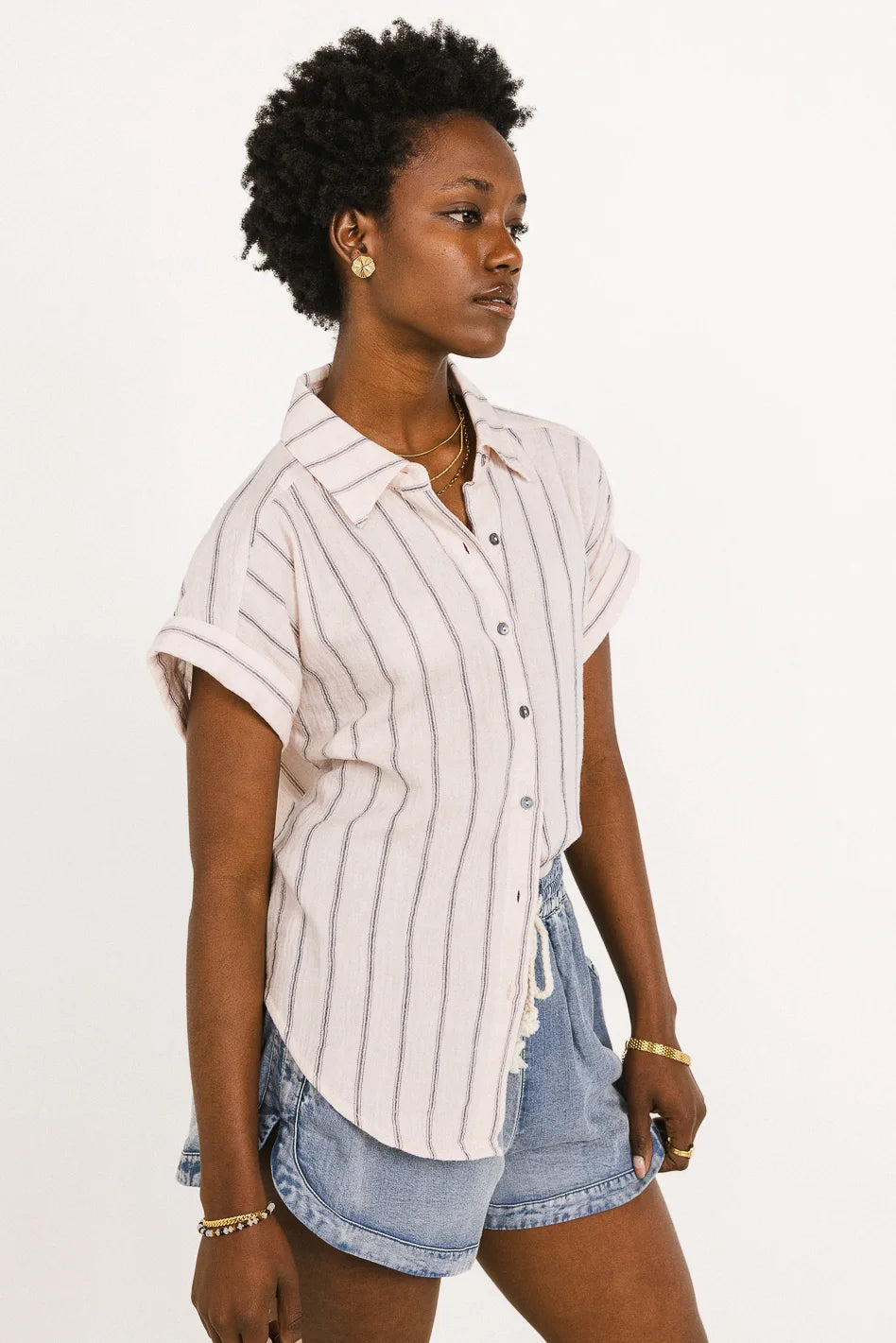 The Topanga Striped Button Up in Pink is about to be you're next favorite top. This collared shirt is so versatile and looks great layered or just on its own. We recommend pairing it with some straight leg jeans and strappy sandals to keep comfy this summer.