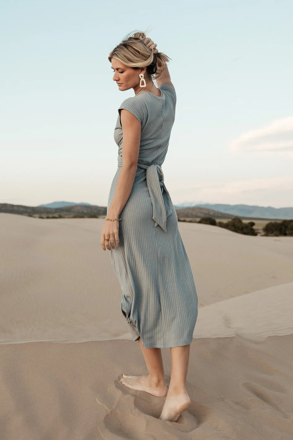 The Vaeda Ribbed Tie Dress in Slate Blue has us absolutely twitterpated. There are so many ways to wear this dress. Cross and wrap the ties over the bodice and knot in the back for a fitted look. Pair with some heels and a simple handbag.