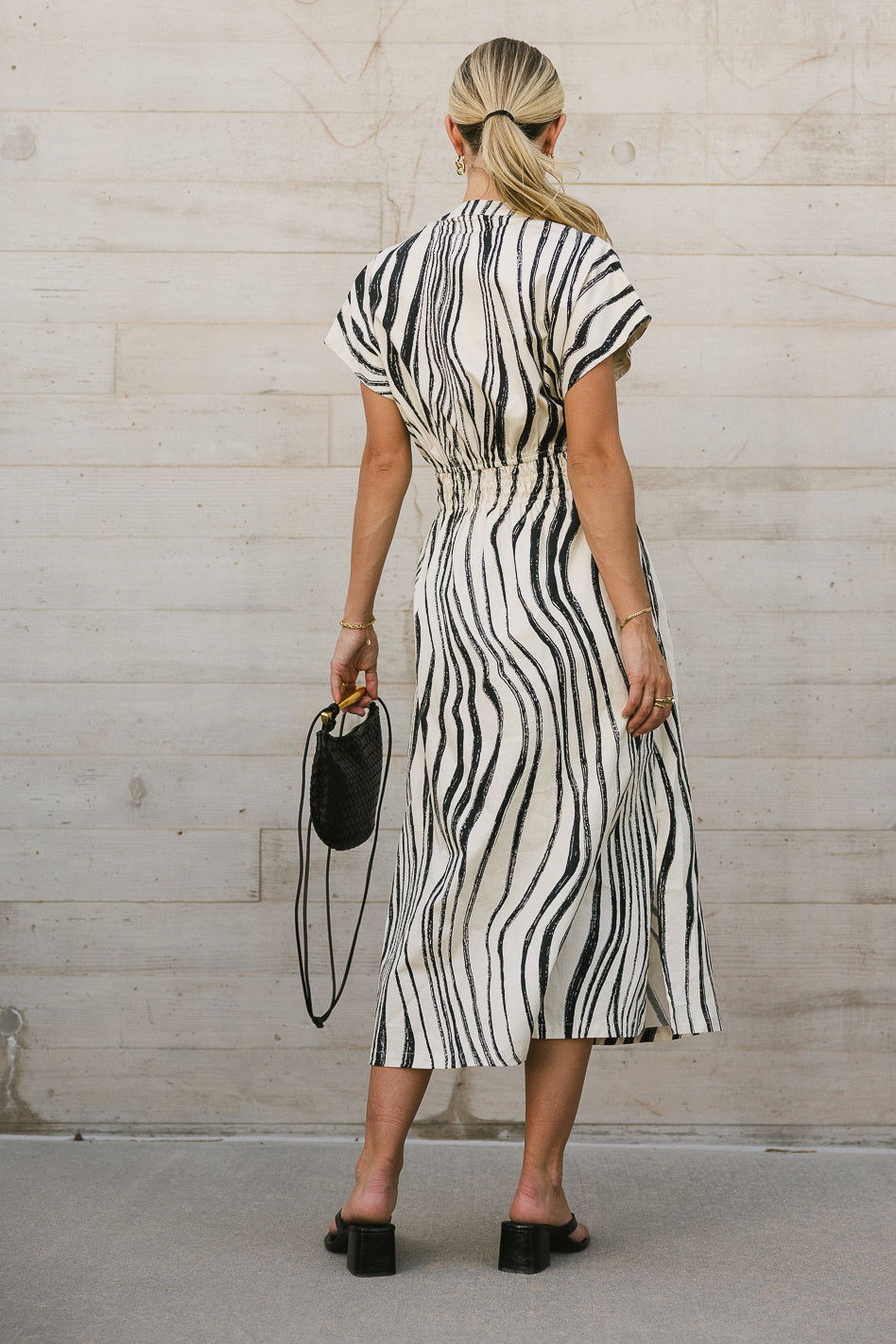 The Winona Abstract Midi Dress is absolutely stunning, making it perfect for formal occasions. For wedding guests, we recommend pairing this dress with a simple heel and a handbag.